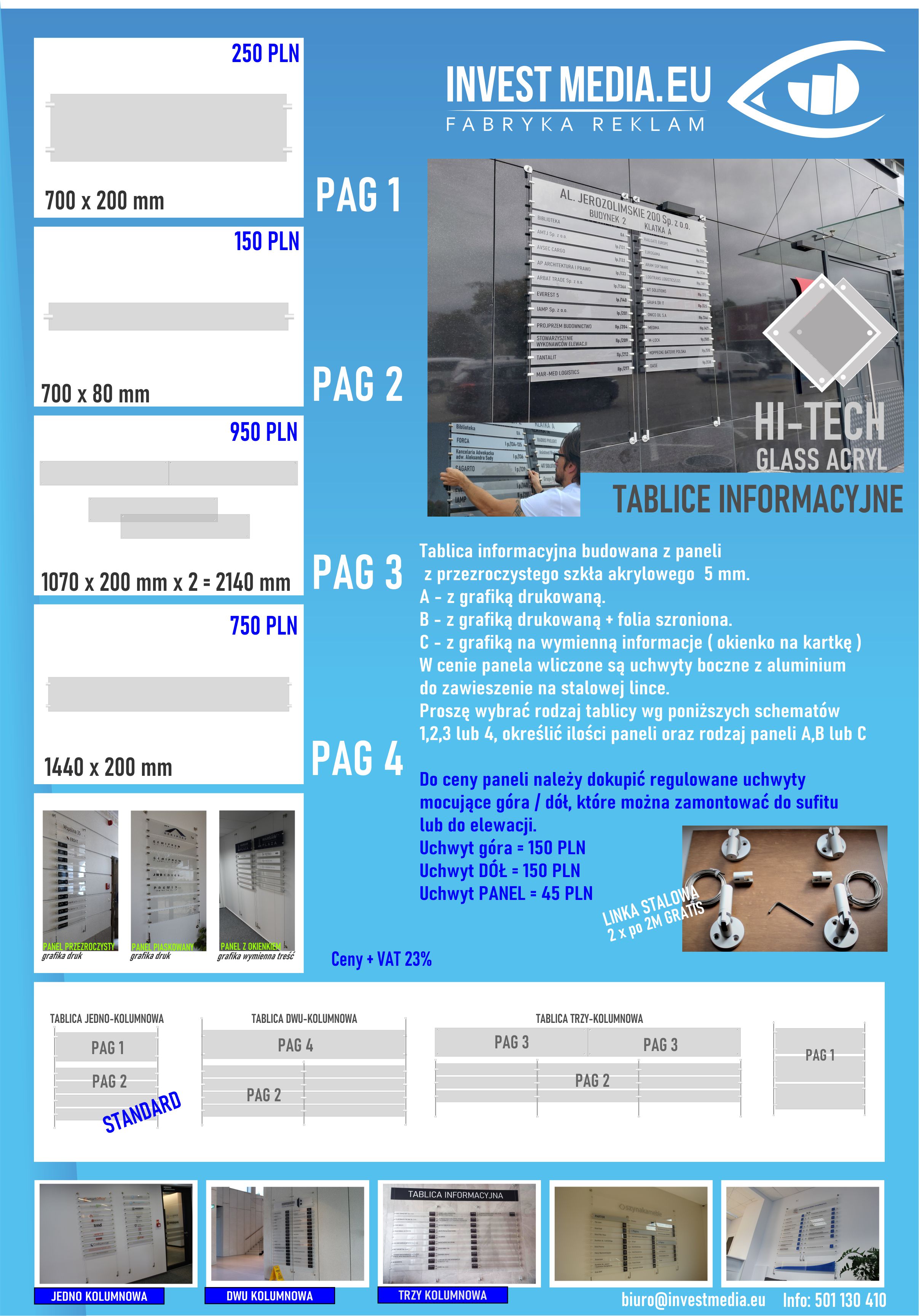 Tablice informacyjne, tablice rozprowadzające informują o nazwach firm mieszczących się w budynku, na jakim znajdują się piętrze i jaki jest numer pokoju danej firmy.