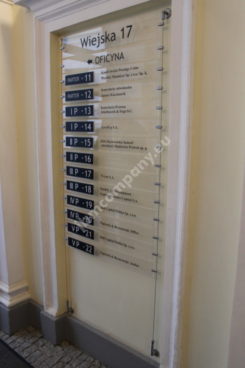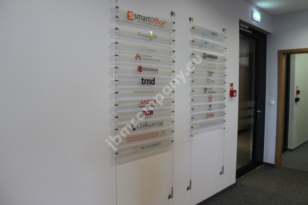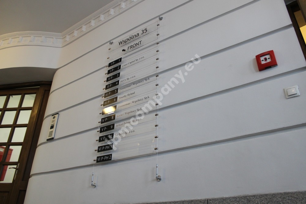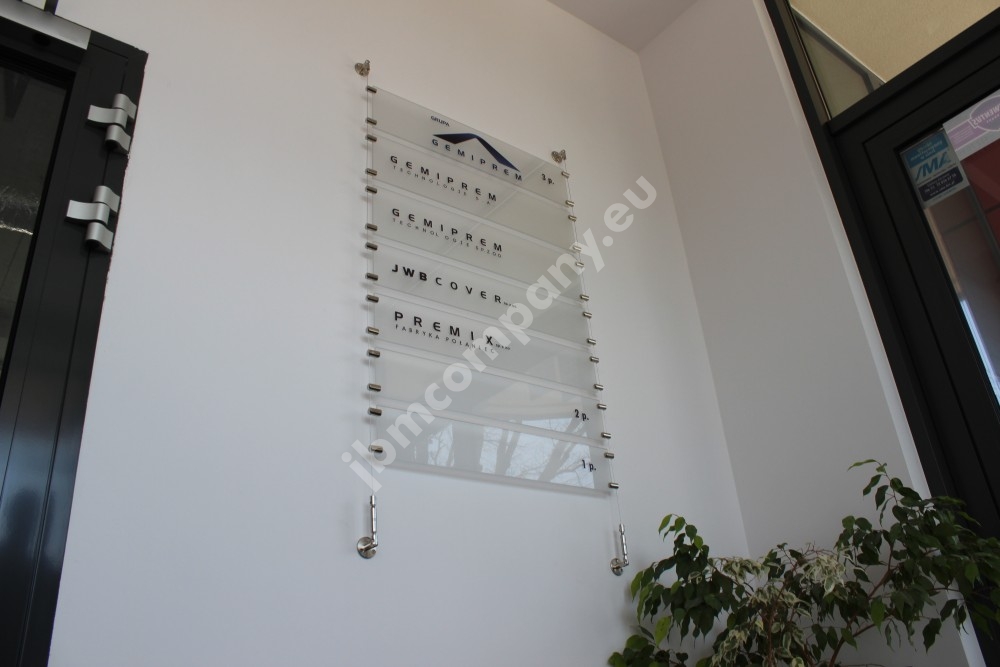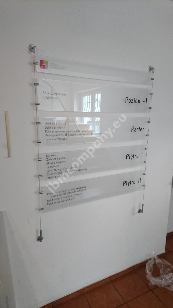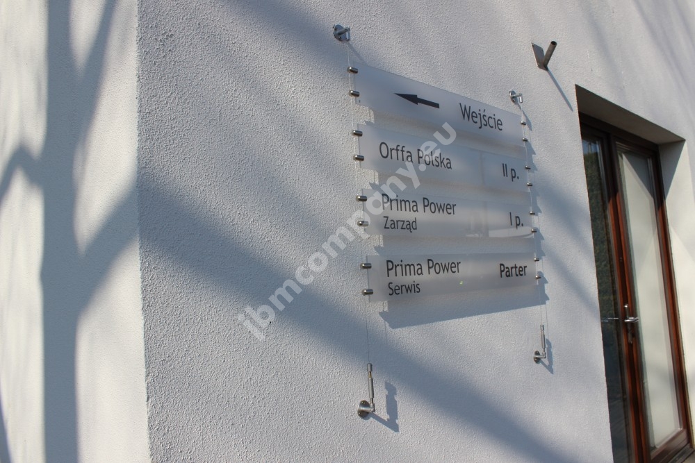 Tablice informacyjne dla najemców na stalowych linkach.